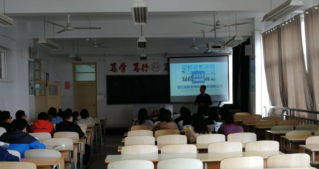 此次专场招聘会提供医药代表、研发人员、技术员等多个岗位。该公司代表向同学们介绍了公司的相关内容。通过招聘宣讲和面试,有部分同学与我武公司达成了就业意向。浙江我武生物科技股份有限公司是一家高科技生物制药上市企业公司,只发展具有重大技术优势或市场优势的创新药物或具有同类医药功能的产品、新医疗器械,并且独立研发、投资或并购符合此述标准的技术、产品或企业;公司致力于从事过敏性疾病诊断及治疗产品的研发、生产和销售,是目前国内唯一能够提供舌下含服脱敏药物的企业和亚洲最大的脱敏药物及过敏原检测试剂生产商。