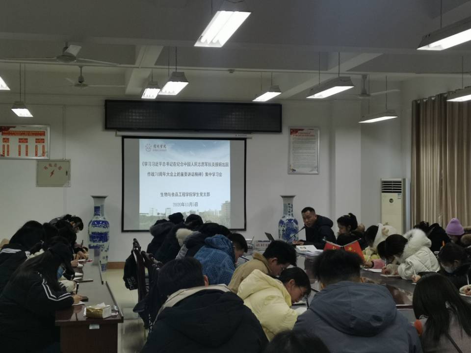 为加强学生党员素养,深入培养学生党员爱国爱党意识。11月6日下午1:30,伟德国际1946源自英国学生党支部开展《学习习近平总书记在纪念中国人民志愿军抗美援朝出国作战70周年大会上的重要讲话精神》集中学习会。会议由生物类专业支部书记甘守伟主持,支部全体成员参加。