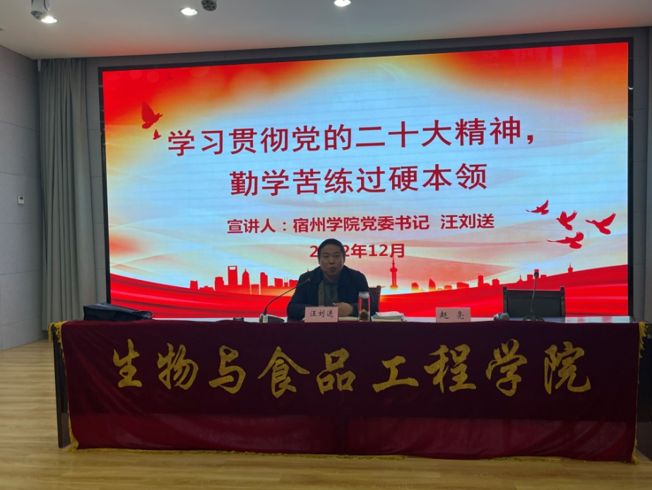 汪刘送书记强调,学习宣传贯彻党的二十大精神,是学院当前和今后一个时期的首要政治任务。希望全体青年学生能够自强自立、全面发展,为实现中华民族伟大复兴奋发作为,不负时代,不负韶华。一是要在全面学习上下功夫,要原原本本学、反反复复学、读原文、悟原理,在学习中深刻领悟“两个确立”的决定性意义,以实际行动坚决做到“两个维护”。 二是要在全面落实上下功夫,希望同学们要全面学习全面把握全面落实党的二十大精神,自觉用习近平新时代中国特色社会主义思想武装头脑,勤学苦练过硬本领,锤炼高尚品格,立志做有理想、敢担当、能吃苦、肯奋斗的新时代好青年。