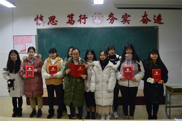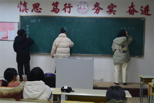 活动伊始,主持人介绍完比赛规则后比赛正式开始。首先,各小组派出代表以抽签形式决定组数。第一环节中参赛小组选出一人做代表,由主持人从题库中抽取15个词语进行听写,并要求选手写出词语释义,在主持人说完所有题目十秒后听写环节结束。在"智寻汉字"抢答环节,选手通过举手快慢获得答题机会,并根据大屏幕上给出的汉字偏旁、结构及拼音等提示答出正确汉字。同学们都争先恐后的举手,迅速地在黑板上写出答案,表现十分出色。在写带有某字的成语环节,同学们滔滔不绝地书写着,可见她们对成语掌握的熟练程度。比赛在同学们的积极答题中进行着,最后在“给偏旁写汉字”环节,有些同学刷刷地写出好多,也有同学一时想不起而失去得分。比赛环节结束后经过评委细心评分,最终,周婧组荣获一等奖,侯晓宇组和王雅琪组获得了二等奖,李婉茹组等三组获得了三等奖。在选手的合影留念中,本次比赛缓缓落下帷幕。