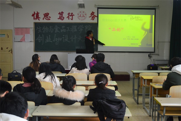 比赛包括作品展示、PPT演讲以及评委点评。每组作品都突显出创新的思维方式与新颖的设计理念,如作品《解忧快递》以电影《超能陆战队》中的大白人物为主体,作品中大白头上的闪电图案寓意快递的速度之快,大白的脸上带有微笑,表达了对待顾客要时刻有良好的态度。同时大白的胸口带有公司的标志,整体给人以耳目一新的感觉,选手的演讲更是十分精彩,引得现场观众掌声不断。又如《生物制药创业公司logo设计方案》整体采用药的象征即主体由胶囊构成,整体选用绿色色调,代表公司产品的环保性与健康度。胶囊周围用两个圆弧将其围住,并用绿色的圆圈进行点缀,给人一种简单明了的感觉。评委根据选手设计的logo的创新性、以及PPT的演讲情况进行点评和打分。最后18生技2班张靖博组获得一等奖,18食科2班刘玉琳组、18生技1班张自清组获得二等奖,18食科1班赵泽春组等三组获得三等奖。
