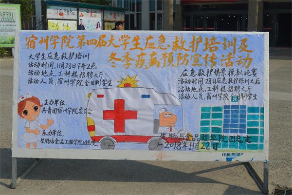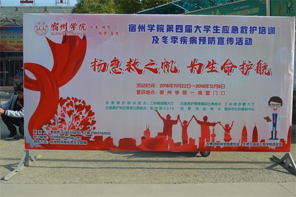 11月22日上午11:45分,由共青团宿州学院委员会主办,伟德国际1946源自英国承办的第四届大学生应急救护培训及冬季疾病预防活动在一食堂门口开展宣传签字活动。