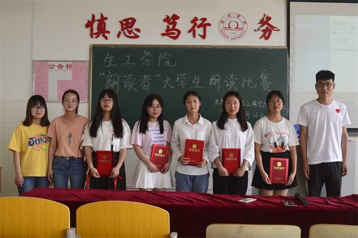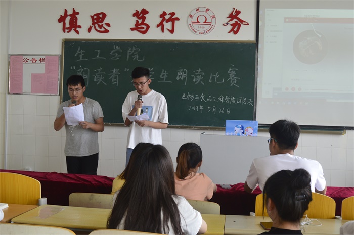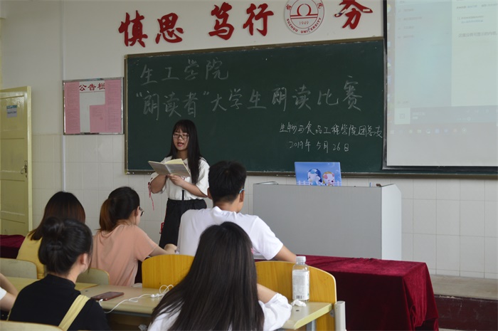 比赛中,选手们怀着饱满的激情,朗读自己喜欢的文学著作选段。选手们对文章进行合理断句,用或激昂或低沉的语调,引领人们去体会作品中美好的情感。如在《傅雷家书》的朗诵中,选手声情并茂、抑扬顿挫的深情吟诵,让我们联想到父母的谆谆教诲,感受到孩子与父母情感的真诚交流,亲人之间的温情溢于字里行间,感动着在场的每一个人。《热爱生命》作品的朗读中,选手结合肢体动作生动地展示出他深厚的情感,让大家感受到人性的伟大和坚强。评委们根据选手阅读内容,情感表达,台风等方面的表现对选手做出细致的评价,同时就选手朗读语调等方面,指出不足之处并给出改良意见。经过一番激烈的角逐之后,18生技1班昂云昭获得一等奖,18生技1班丁雨康等获得二等奖,18食科2班刘玉琳等获得三等奖。