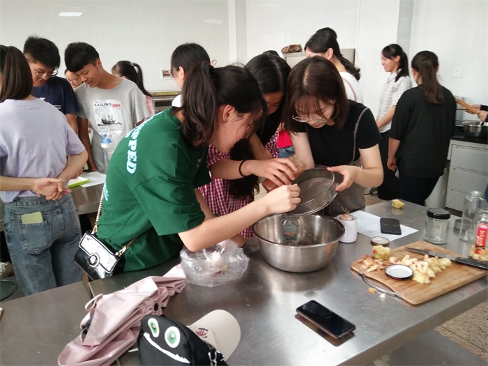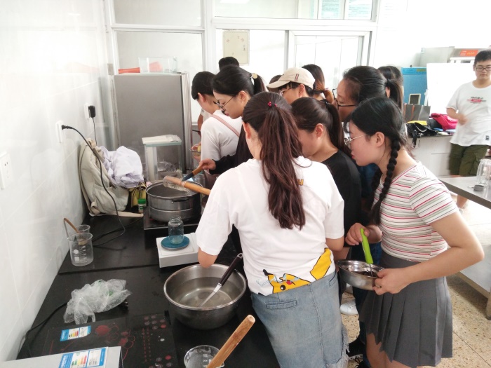 比赛开始前,各组选手按照比赛要求,带着事先准备好的透明容器与精心挑选的各种水果到实验楼A317集合,活动负责人进行签到并按顺序分配好各组实验台后,果酒制作正式开始。参赛选手将各种各样的水果在负责人的指导下对水果进行清洗,去核、切块、压榨,在处理水果的同时,还将带来的透明容器进行高温消毒并冷却。各组参赛选手充分利用手中的工具来解决制作果酒的道具不齐全的问题,展现其独具匠心的智慧。比如桃子的制作,去核的工具无法正常使用,参赛选手用刀一点一点将果肉剥离下来;在没有榨汁机使用的时候,选手们将切碎的水果放在容器中,使用擀面杖进行研磨。水果处理完成后,选手们又根据合理的比例,向容器中添加一定量的酵母菌与蔗糖溶液,然后密封编号。经过为期三天的发酵,果酒制作基本完成,评委们根据果酒成色对各组成品进行打分,最终,17食科1班徐玉萍等获得一等奖,18生技2班刘梦丹等获得二等奖,18食科1班徐明慧等获得三等奖。