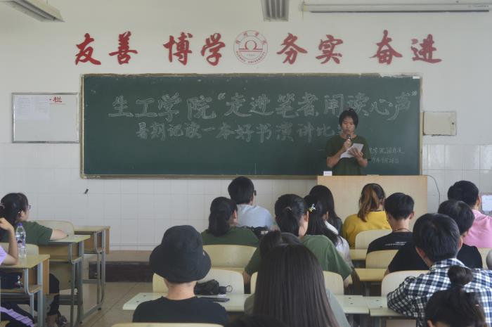 经活动前期宣传,同学们积极响应,踊跃参与报名。比赛采用抽签形式进行排序,按序上台演讲。比赛现场井然有序,选手们流利的诵读、端庄的姿态、饱满的情感,在赛场上洋溢自信,肆意挥洒。有的同学精心准备,选用与演讲主题相适应的背景音乐,朗朗的诵读声与乐声相辅相成,营造了应景的氛围,感染者在场的每一个人,令在场观众和评委无不动容;还有的同学选择以组队的方式开展演讲,他们分工明确,配合默契,交织的声音给人以美的享受。或激昂,或低沉,或优美,或恬静的嗓音带领大家走进文学,领略文学的魅力。选手结束演讲后,评委们都给出了精彩的点评并指出不足之处使选手获益匪浅。经过紧张激烈的角逐,18生技2班陶旭等荣获一等奖,19生技1班的崔迪等荣获二等奖,19生技2班的车晨苏等荣获三等奖。