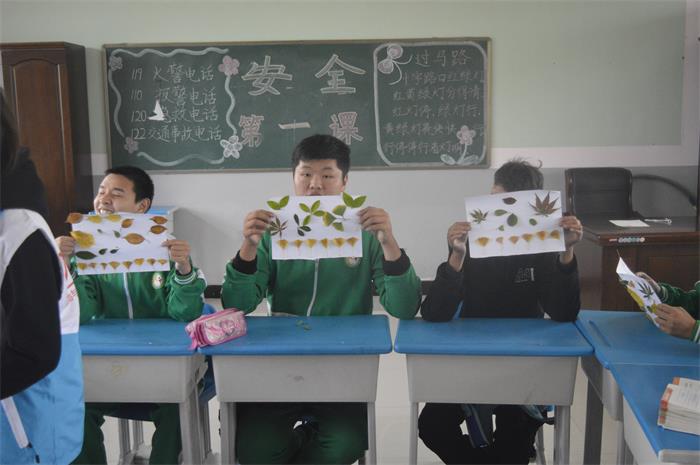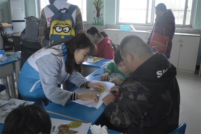 上午6点30分,志愿者们于公交车站台集合,待全员到齐后乘车抵达特殊教育中心,由负责人分组布置任务并讲明注意事项。经过领队与特教中心教师协商,志愿者分为5组进入各自班级与孩子们进行活动。孩子们十分热情的邀请志愿者们坐下与他们一起听课。课堂上,孩子们积极踊跃的发言赢得了志愿者们的一致赞扬,他们天真活泼的话语使课堂充满欢乐与活力。下课后,志愿者们利用特教中心预留的时间教孩子们做叶画。志愿者为孩子们展示一张张叶画作品,将准备好的材料分发给每个人,并指导他们进行叶画创作。孩子们天马行空的想象经由他们灵巧的小手进行操作,一幅幅精美的作品在他们的手下诞生,优美的风景画、可爱的小动物跃然于纸上,展现出他们独特的想法与出色的动手能力。他们欣喜的交给老师观看,得到老师表扬后,那开心灿烂的笑容是给每位志愿者最好的礼物。随后志愿者们将这些作品进行粘贴并交由老师保管,将孩子们的笑容与他们的作品记录于照片上,暖心氛围萦绕在班级之中。