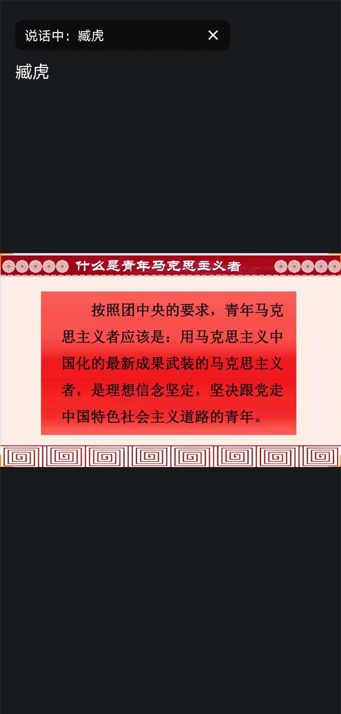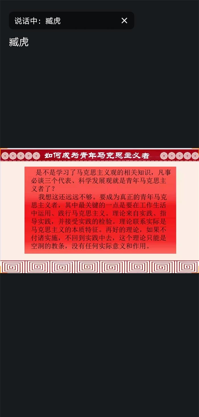 讲座围绕“什么是马克思主义”、“如何成为马克思主义者”等四个方面进行讲解。点明当代青年是最富有活力、最具有创造力的社会群体。做新时代青年马克思主义者,必须坚定马克思主义信仰,坚持正确政治立场,矢志不渝的为实现中国特色社会主义共同理想而奋斗。讲座开始,臧虎向同学们介绍了马克思主义的的创立者和它的三大部分组成,在讲解“如何成为青年马克思主义者”时,主讲人提出“学习至关重要”这一观点,督促同学们要努力学习科学文化知识,在学习中抓重点、钻难点、找落点。最后,臧虎从四小点来向同学们讲述成为真正的青年马克思主义者应具有的品质,鼓励同学们为实现中华民族伟大复兴的中国梦贡献青春、智慧和力量。
