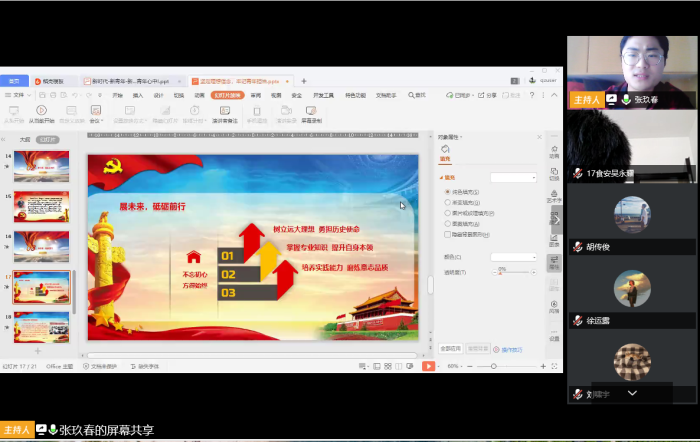 本次讲座主要围绕“忆往昔,峥嵘岁月稠”、“看今朝,奋斗正当时”、“展未来,砥砺前行”三个方面进行介绍。作为新时代的青年,习近平总书记对青年给予厚望,提出青年兴则国家兴,青年强则国家强的观念。讲座期间,张玖春从五四运动开始介绍,并引用伟人邓小平的寄语:青年是我们的未来,革命事业要靠年轻一代去完成。没有青年进来,就好像人缺乏新鲜血液一样。同时,张玖春表示青年大学习作为最接近我们学生的思想教育,我们每一次都要认真完成,并且不仅从中认识党的最新指导思路,还要从中有所感悟。讲座最后,张玖春倡导大家掌握专业知识,提升自身本领,为新中国的时代建设添砖加瓦。