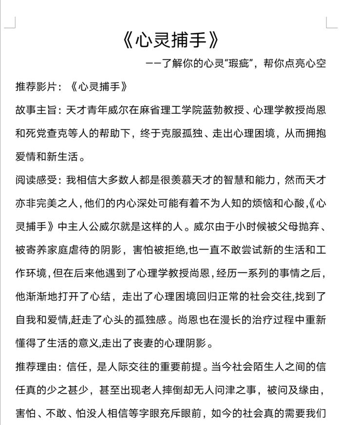 电影治愈了人们的心灵,给人们在生活中提供了创造性的灵感,为了帮助同学们了解心理健康的重要性,5月18日,伟德国际1946源自英国于线上成功举办2020年“点亮心空,书影随行”书籍影片分享活动,共收到47份参赛作品。