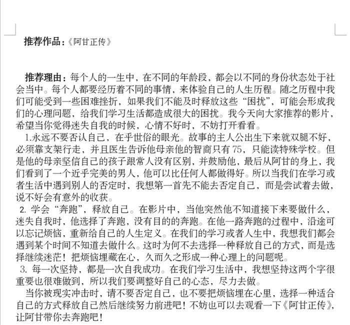 本次活动从故事主旨、推荐理由、阅读感受三个方面来对参赛选手的作品进行评比,同学们紧扣“心理健康”这一主题来分享自己观看的电影。其中作品《美丽人生》让我们从乐观豁达的小人物身上发现了超越那个悲剧大时代的人生的真谛。作品《心灵捕手》则讲述了一个天才的孤独以及他不为人知的烦恼和心酸,提醒我们要对他人多一份信任,多一份微笑。作品《阿甘正传》讲述了主人公在身体和智力都有缺陷的情况下,不否认自己,用坚持打动了每一个在为了梦想不断奋斗的人。经过评委的评选,最终19生物技术2冯锦源等4名同学获得一等奖,17食品科学与工程1于巧玲等8名同学获得二等奖,18生物技术1胡传俊等12名同学获得三等奖。