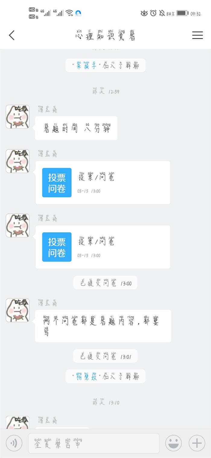 本次比赛以线上作答的形式进行,考题由必答题和抢答题两部分组成。活动初期,参赛人员认真阅览心理学习的资料准备答题。题目主要考察学生对心理知识的掌握和自我心理的调控支配能力。活动如火如荼的进行着,参赛人员通过学习通等学习软件积极抢答,现场气氛热烈,充分调动了同学们的积极性。经过最终角逐,18生物技术1班鲁平等2名同学荣获一等奖;19药学班曾紫薇等4名同学荣获二等奖;19生物技术1班张妍等8名同学荣获三等奖。