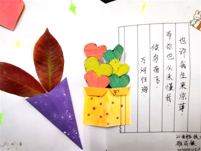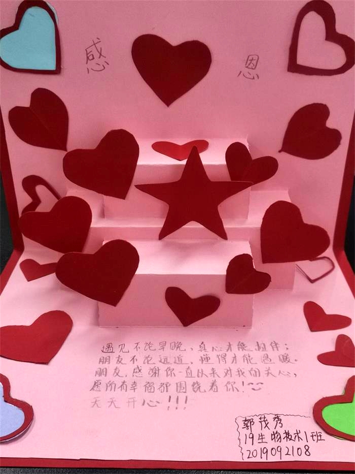本次贺卡制作活动的主题是“感恩你我,共同成长”,由同学们制作贺卡并将作品交于班级负责人,班级负责人统一将作品交到活动作品收集处。在此次活动中,选手们围绕感恩的主题,将感恩与成长紧密的联系在一起,并利用制作精美、造型独特的贺卡来表达自己对家人、老师、朋友的感激,弘扬了同学们懂得感恩的良好美德。评比时,评委们通过贺卡的布局、画面、文字等方面评选出各等级奖项。最终,19生物技术1班郭茂秀等8人获得一等奖,20药学郑梦晴等12人获得二等奖,20食品科学与工程董睿等15人获得三等奖。