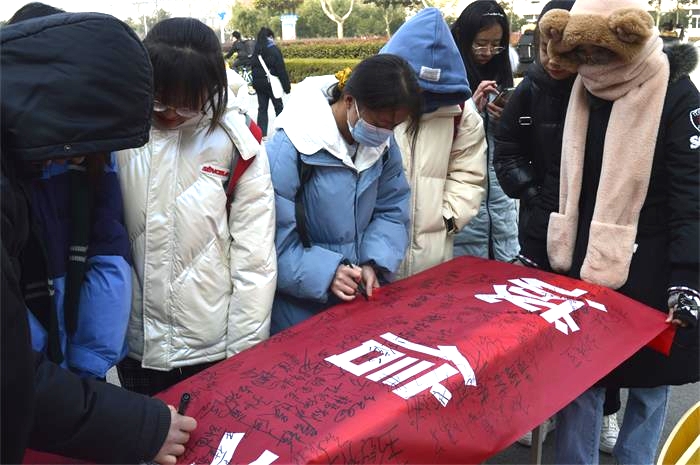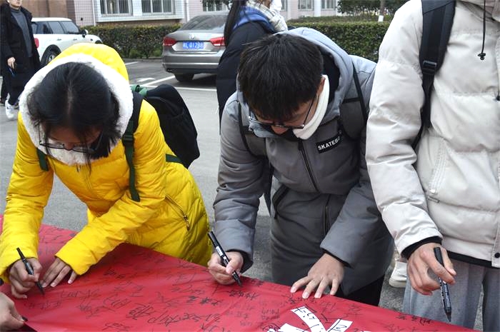 活动现场,活动负责人拉开印有“诚信考试光荣,违纪舞弊可耻”的红色的条幅,向同学们热情宣传诚信考试的重要性及如何合理安排复习时间的相关知识。现场气氛热烈,同学们热情高涨,积极配合活动负责人的工作,有序的在横幅上签字,以表达自己在即将来临的期末考试中必胜的决心。签字的同时,宣传人员积极倡议同学们遵守考试纪律,杜绝一切作弊行为,切实做好考前复习准备,并祝愿同学们实现成绩和人格的双丰收。签字活动结束后,同学们有序离场。