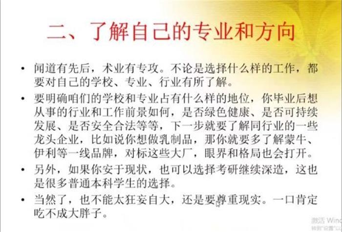 首先,曹玉瑶学姐以同学们步入大学后对未来的疑惑作为切入点,将大学四年划分为四个阶段,并分别给予经验上的分享与告诫,强调四六级考试和专业课学习的重要性,以及尽早做出就业还是升学的决定。并希望同学们能够积极参加各类活动丰富校园生活,累积实战经验,尽力拼搏,不负初心。随后,王腾学长通过一个故事引入了职业生涯规划话题,并强调未来之路拿好人生三宝。告诫同学们要充分了解好自己的专业和方向并早打基础,少走弯路。王腾学长还向同学们详细介绍了自己大学期间的规划,并对未来选择工作的同学们提出了一些建议。最后,学长学姐细心解答同学们所提出的问题,并诚心希望同学们能够明确未来的目标和方向,努力拼搏。