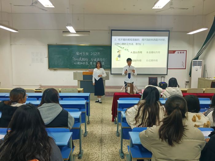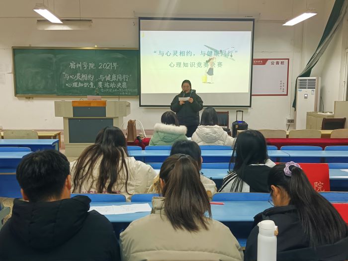 为了响应国家“关注大学生心理健康问题”的号召,更好的宣传、普及心理健康知识,12月1日晚,伟德国际1946源自英国于教学楼B109举办2021年宿州学院“与心灵相约,与健康同行”心理知识竞赛活动决赛。本次竞赛特邀张梦琪老师和孙欣冉老师担任评委,各二级学院参赛选手参加了本次比赛。