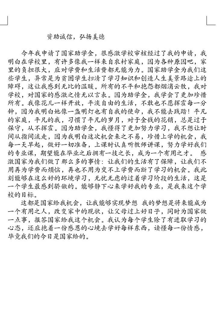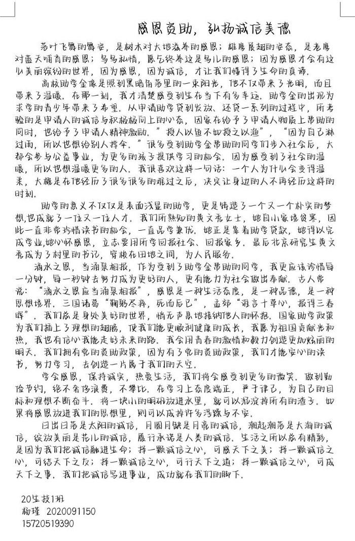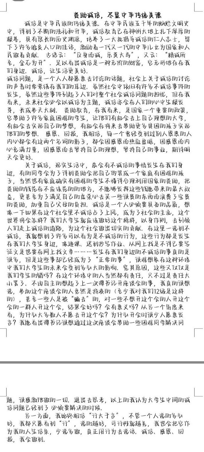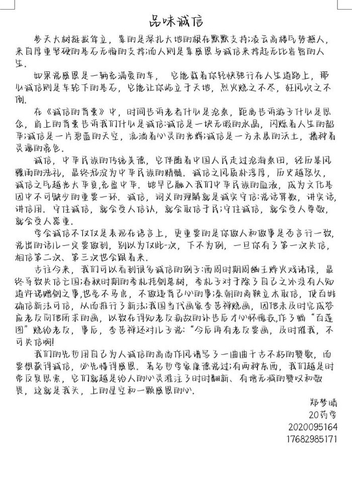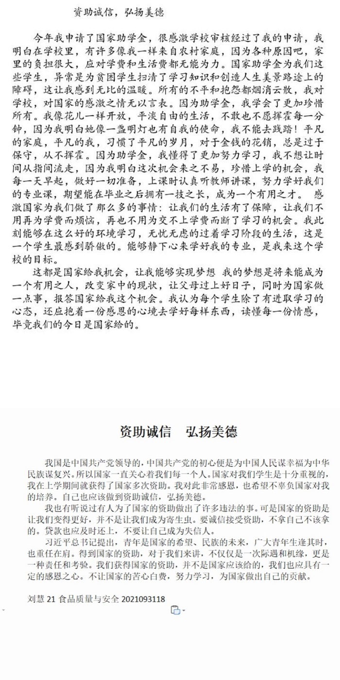 诚,是为人之本;信,是立身之道。人无信,则不立;家无信,则必衰;国无信,则必危。自古关于诚信就有曾子杀彘、尾生抱柱、商鞅立柱为信、季诺一诺千金等典范。所以说,诚信就是中华民族的光荣传统。同学们主要以记叙文,议论文的形式深切的表达出自己对诚信的认识与感悟,紧扣资助诚信这一主题。评委们认真阅读,公正评分。最终,21级生物技术2班赵威等2人获得一等奖,21级食品科学与工程余慧等3人获得二等奖,21级药学王子怡等5名同学获得三等奖。