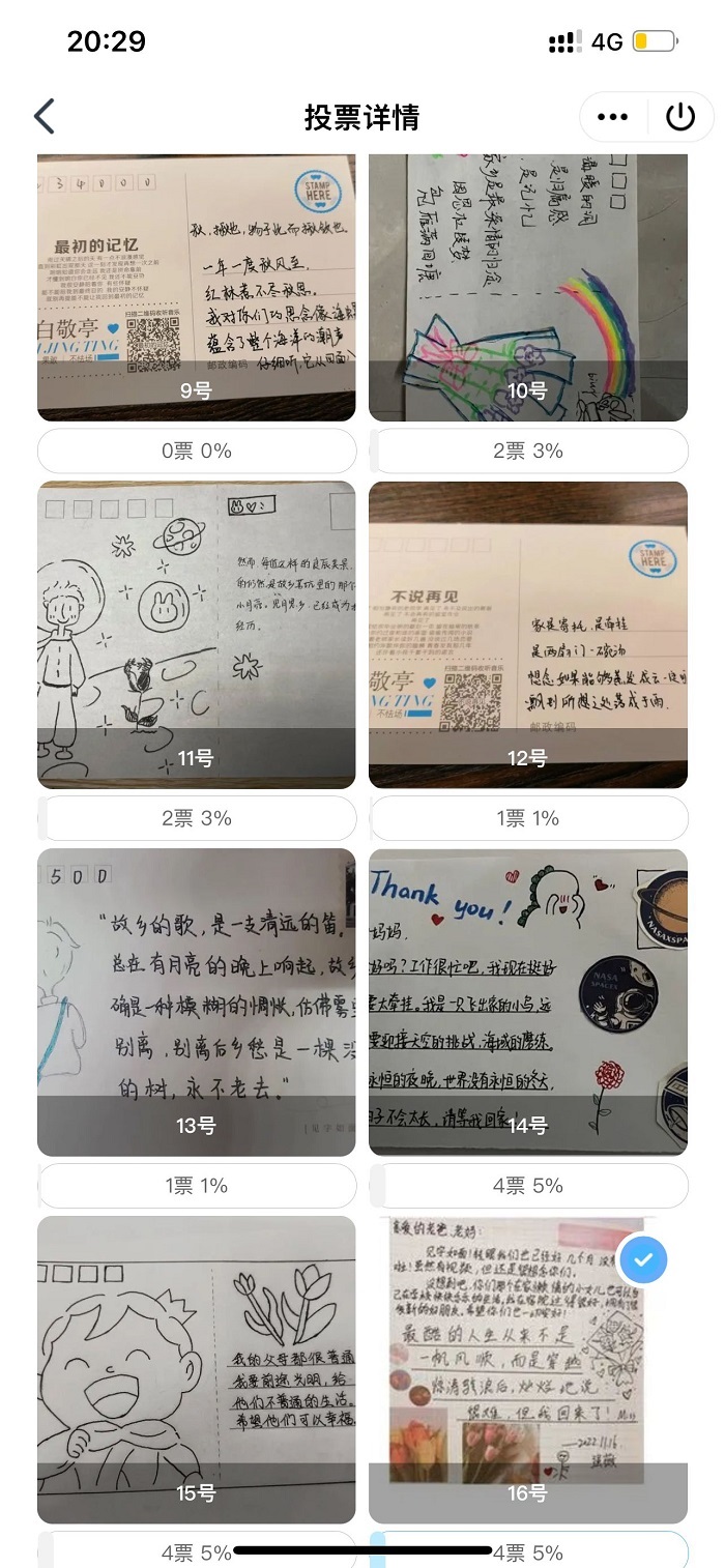 鱼传尺素、驿站梅花已经成为历史,取而代之的是跳动的键盘和夸张的表情包。快捷的沟通固然好,但是那份缓慢而安静的美好也不应当就此被抛弃。而此次的家书明信片活动就是一个机会,让同学们能够以一种特别的方式表达自己的情感。此次活动自举办开始,就收到了同学们的大量作品,而此次活动的评委们也认真负责,秉着公平公正的原则,对同学们的作品进行了评选。经过初选,网络投票最终,22食品科学与工程陈星等2人获得了一等奖,22食品科学与工程刘嘉莹等5人获得了二等奖,21生物技术1班王雨凤等9人获得了三等奖。