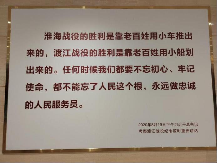 习近平总书记参观渡江战役纪念馆时强调,渡江战役的胜利是靠老百姓用小船划出来的。在“历史现场”,感受人民的伟大力量,不忘为民初心,牢记使命担当,做忠诚的人民服务员,永远在路上。