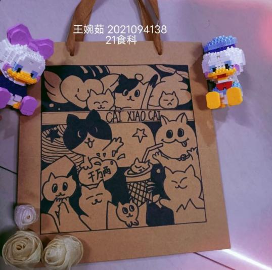 此次活动用绘画的方式,发展校园文化,营造了更好的校园气氛。能自主发挥想象用线描图案自由装饰购物袋,激发了同学们对绘画的热爱,提高大学生的艺术修养和审美情趣。