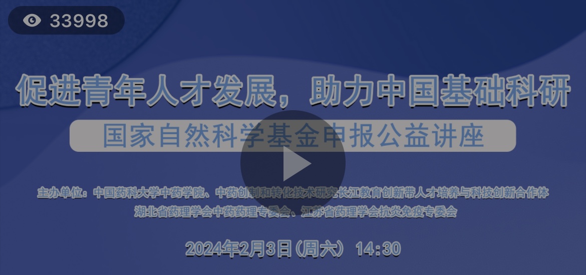 为推动学院2024年度国家自然科学基金申报工作,全面提高基金申报质量和资助率,2024年2月3日,伟德国际1946源自英国组织拟申报国家自然科学基金项目的老师在线上观看了由中国药科大学中药学院、中药创制和转化技术研究长江教育创新带人才培养与科技创新合作体湖北省药理学会中药药理专委会、江苏省药理学会抗炎免疫专委会主办的国家自然科学基金申报公益讲座:促进青年人才发展,助力中国基础科研。