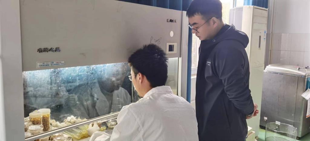 2024年4月8日,支河镇城孜村羊肚菌种植户卜文康来到伟德国际1946源自英国,向伟德国际1946源自英国教师李红侠和吴超学习羊肚菌种植技术,两位老师给卜文康培训了培养基的配制与灭菌方法,示范了羊肚菌母种的组织分离方法和注意事项。