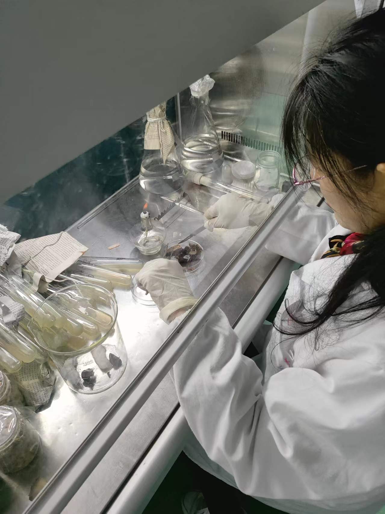两位老师首先给种植户作了详细的理论讲解,然后进行了现场实操。李红侠老师强调,分离菌种时,尽量不要用升汞、来苏尔等消毒剂对子实体表面进行消毒,因为这些消毒剂容易浸入子实体,杀死菌丝,也不需要用无菌水过度清洗,因为水容易渗透入菌肉组织,把表面的杂菌带入接种块造成污染,导致组织分离的失败。