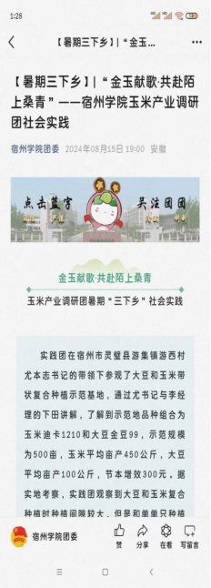 ●“金玉献歌——共赴陌上桑青”玉米产业调研团暑期在安徽省宿州市灵璧县对其玉米产业展开了调研实践活动。通过与农业生产合作社经理、村民和尤书记的交谈中,同学们了解到近年玉米产业的生产与销售情况,玉米种植过程中的病虫害防治方法、灌溉系统、播种施肥和采收过程等,了解到科技兴农的重要性。通过本次的实践活动,旨在通过深入调研玉米产业现状,探索乡村振兴新路径,为地方经济发展贡献青春力量。