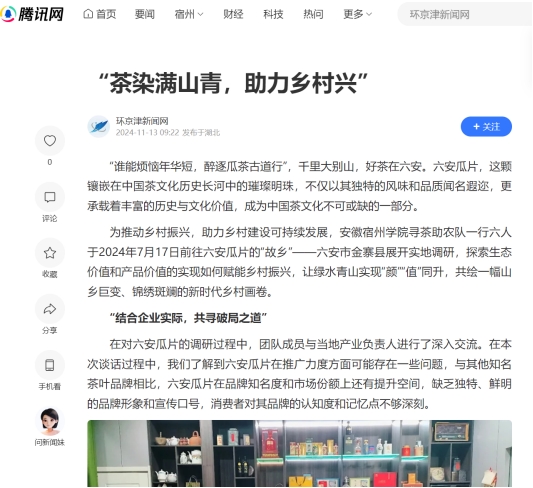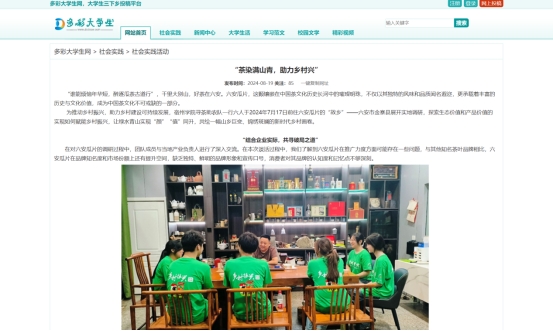 ●宿州学院“寻茶助农”队一行六人来到安徽省六安市金寨县进行乡村振兴暑期社会实践活动,通过探访茶园与茶农交谈,了解到茶叶种植的情况以及生长环境对于六安瓜片茶叶带来的影响,与当地政府以及企业进行深入的交流,了解到政府以及企业大力支持推动茶产业带动乡村经济发展。同时,团队在当地茶叶销售市场进行了茶叶销售一系列活动,对于茶叶包装技巧,销售技巧以及当下茶叶销售情况有了更深入的了解,对于当下经济发展有了更深入的思考。