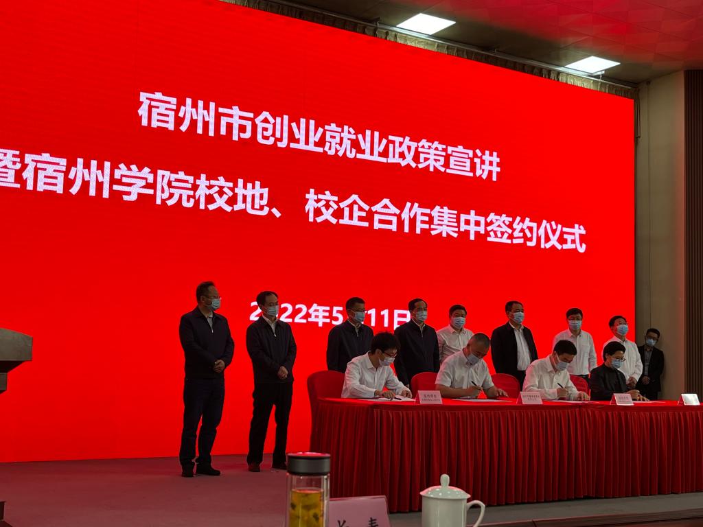 学院对接会后,学院领导和企业代表共同前往学校报告厅参加宿州市创业就业政策宣讲暨宿州学院校地、校企合作集中签约仪式,在签约仪式上,张兴桃与宿州市徽香源食品有限公司董事长吴向东,翟科峰与安徽瑞美药业有限公司分别签署了校企合作框架协议,此次校企合作协议的签署,将会进一步加快校企双方在人才培养、专业共建、科学研究等领域的合作步伐,从而为双方在今后的合作发展提供更为广阔的空间和更加坚实的平台。