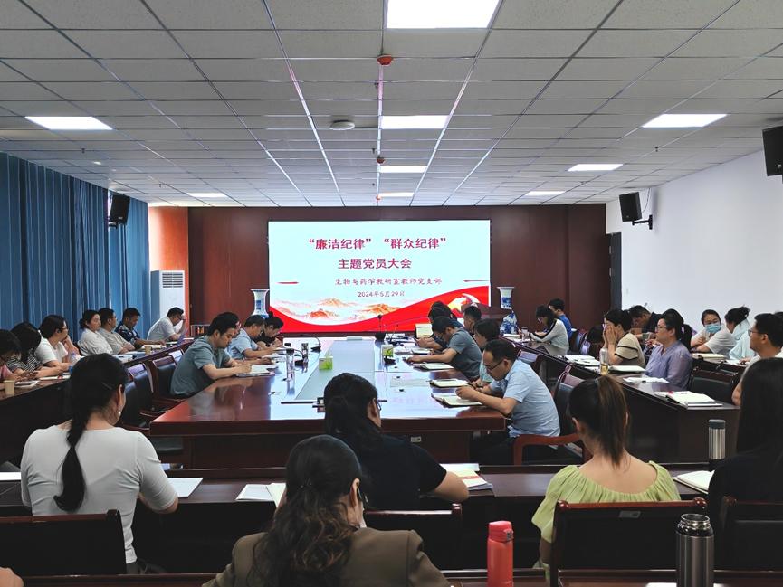 为进一步加深对《关于新形势下党内政治生活的若干准则》、《中国共产党纪律处分条例》的理解把握,引导全体教师党员学纪、知纪、明纪、守纪,推动党纪学习教育走深走实,5月29日下午生物与药学教研室教师党支部在学院会议室召开“廉洁纪律”“群众纪律”主题党员大会