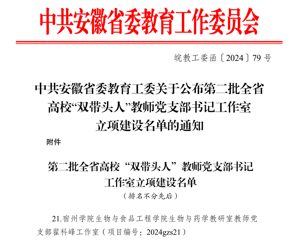 近日,中共安徽省委教育工委印发《关于公布全省第二批新时代高校党建示范创建和质量创优及“双带头人”教师党支部书记工作室立项建设名单的通知》(皖教工委函〔2024〕7号),生物与药学教研室教师党支部(翟科峰同志)工作室入选第二批全省高校 “双带头人”教师党支部书记工作室立项建设名单,这是我院党建工作取得的新突破。